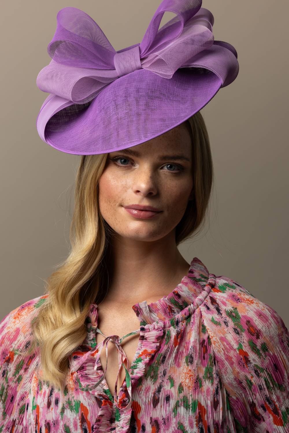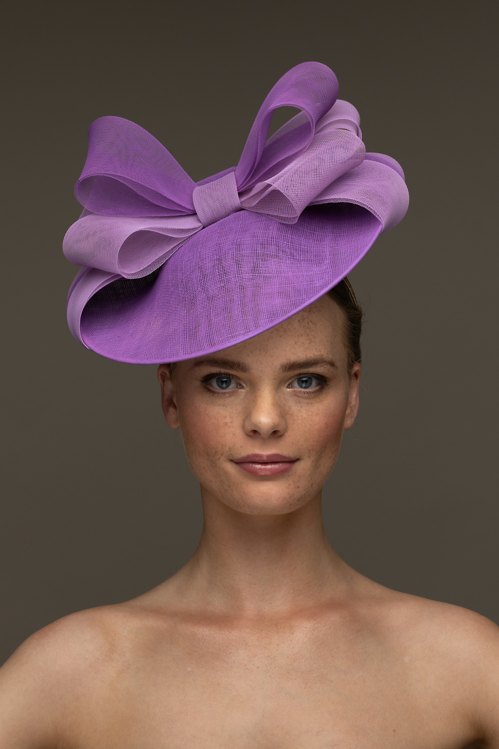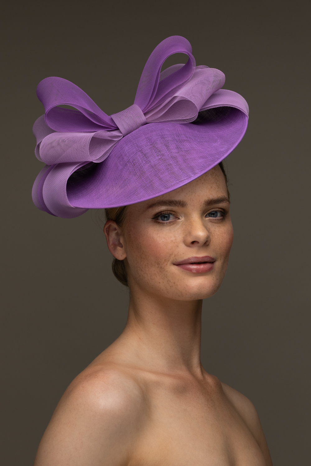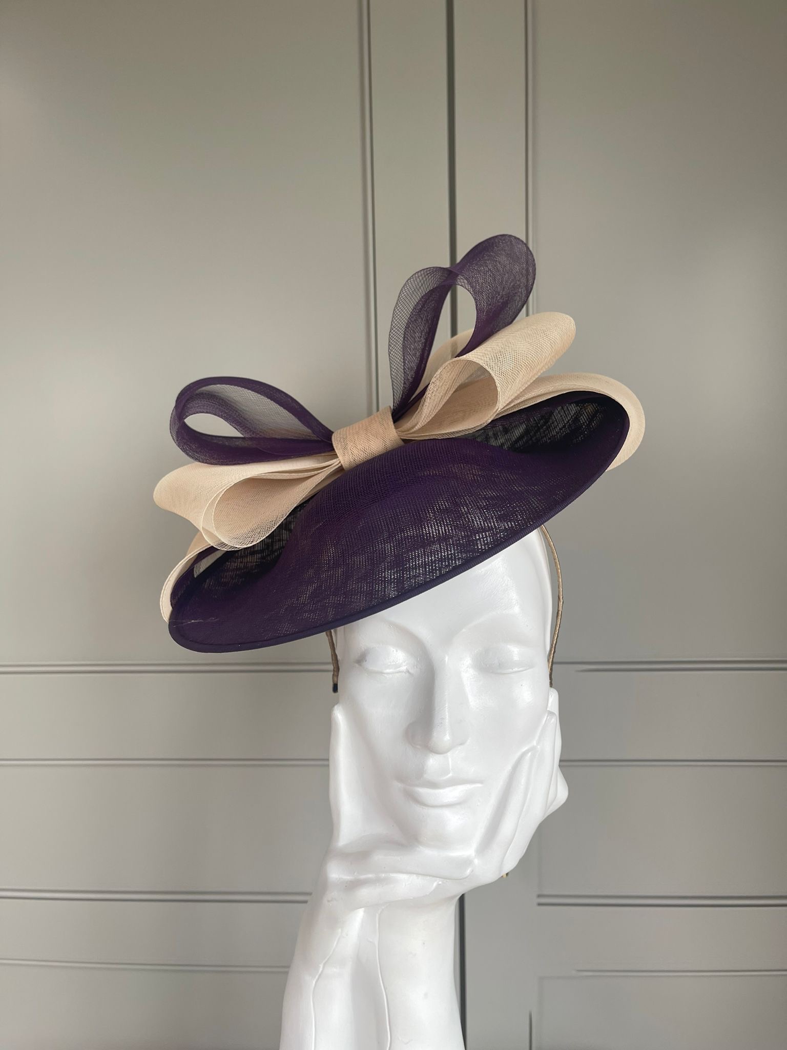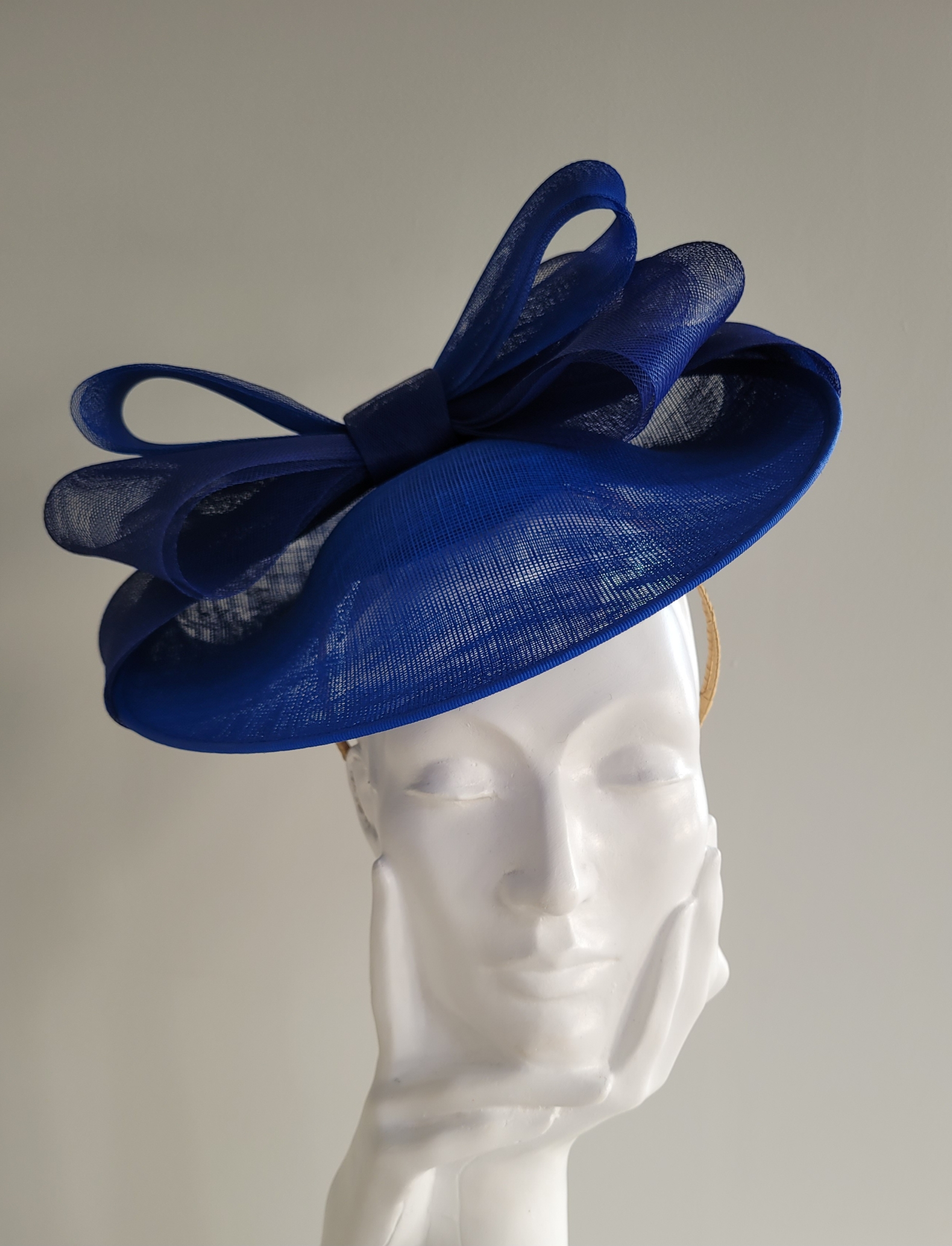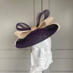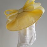 The Tourmaline dish hat is the perfect, neat wedding or race day hat. This hat comprises a 12″ sinamay dish base trimmed with a generous crinoline bow that wraps underneath the brim of the hat to the back. You can choose up to two colours for the bow, whether they are tonal or completely clashing we love this detail.