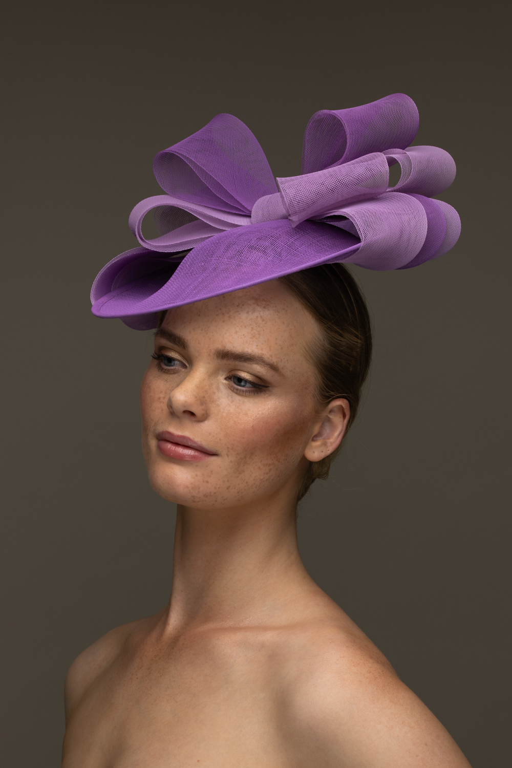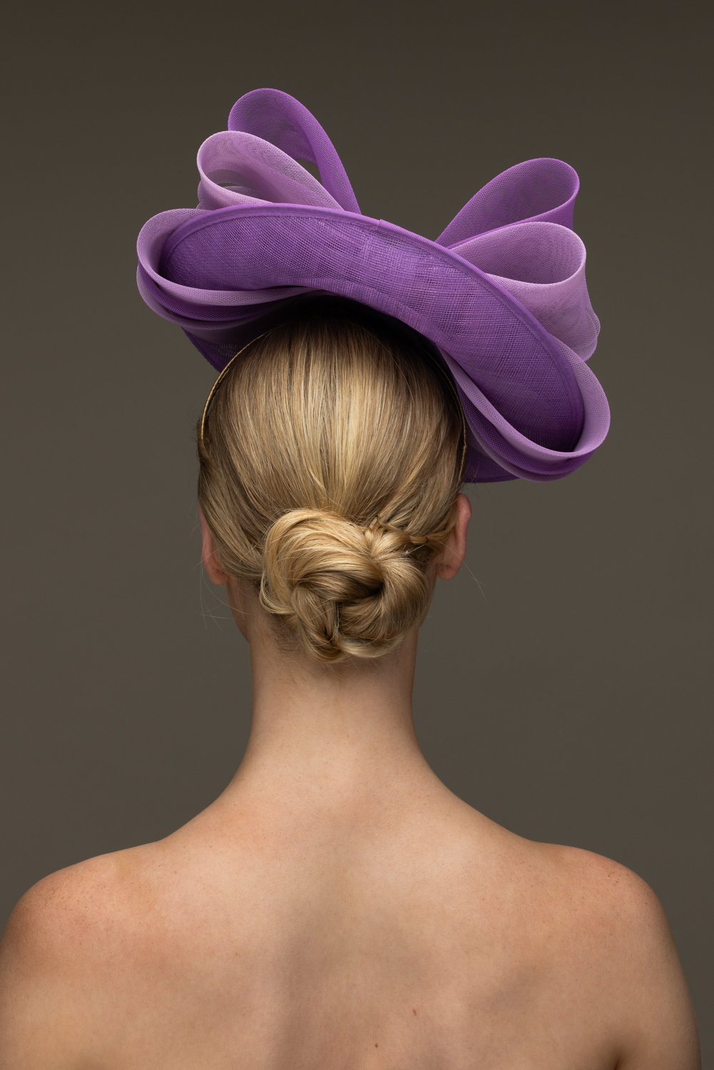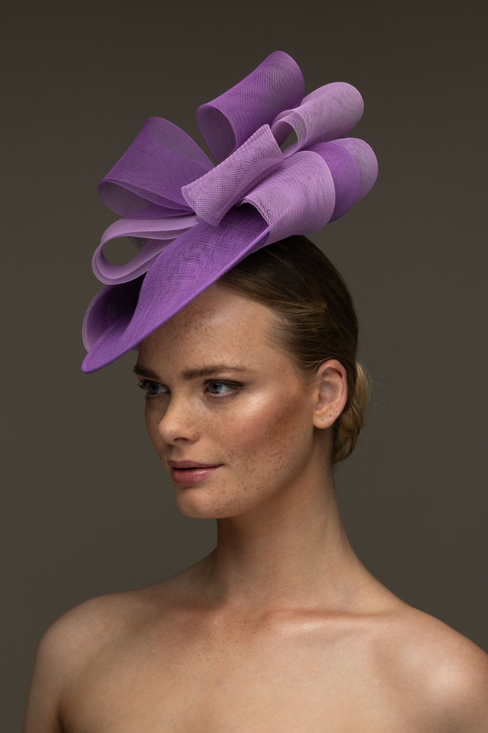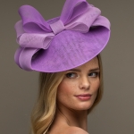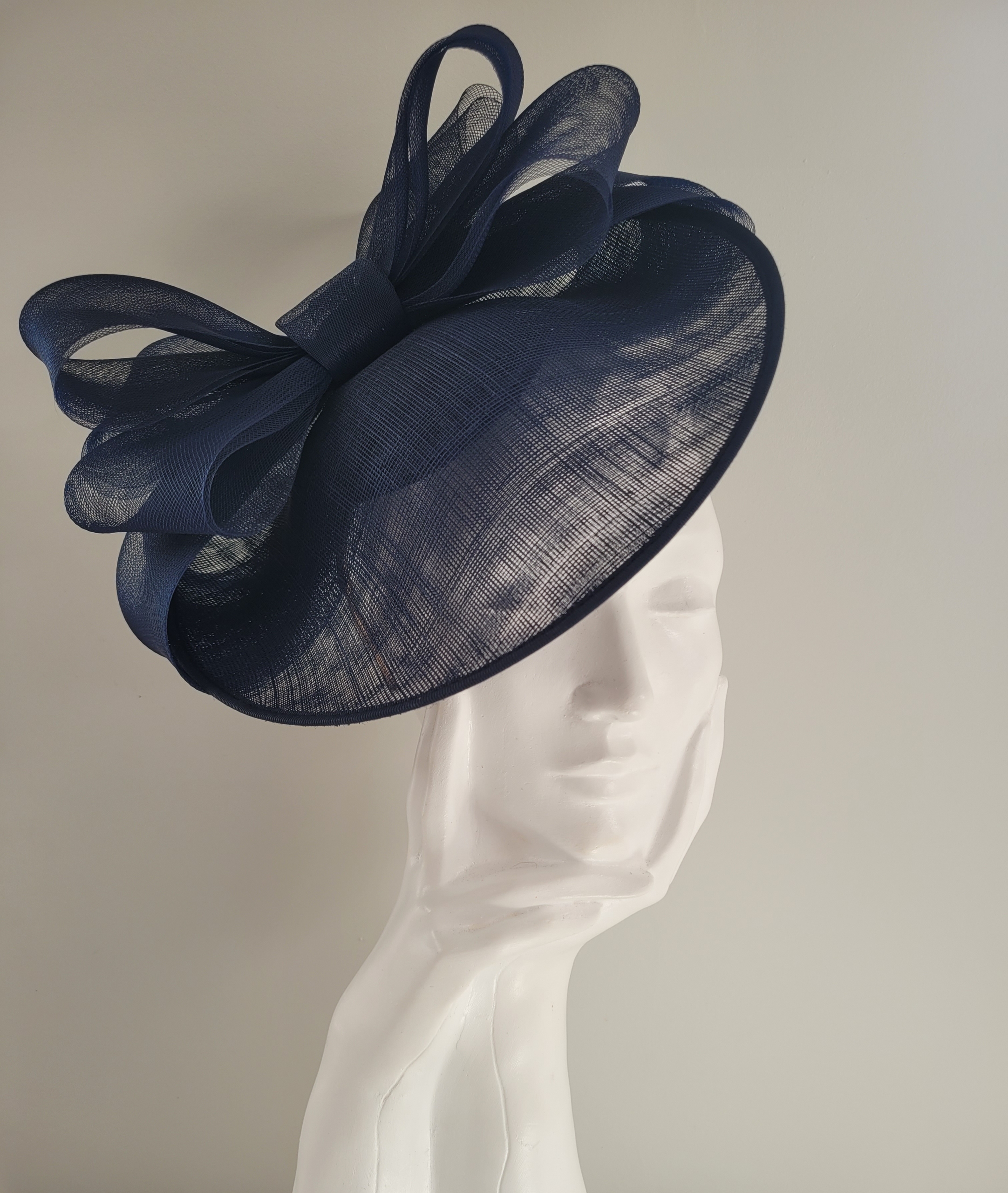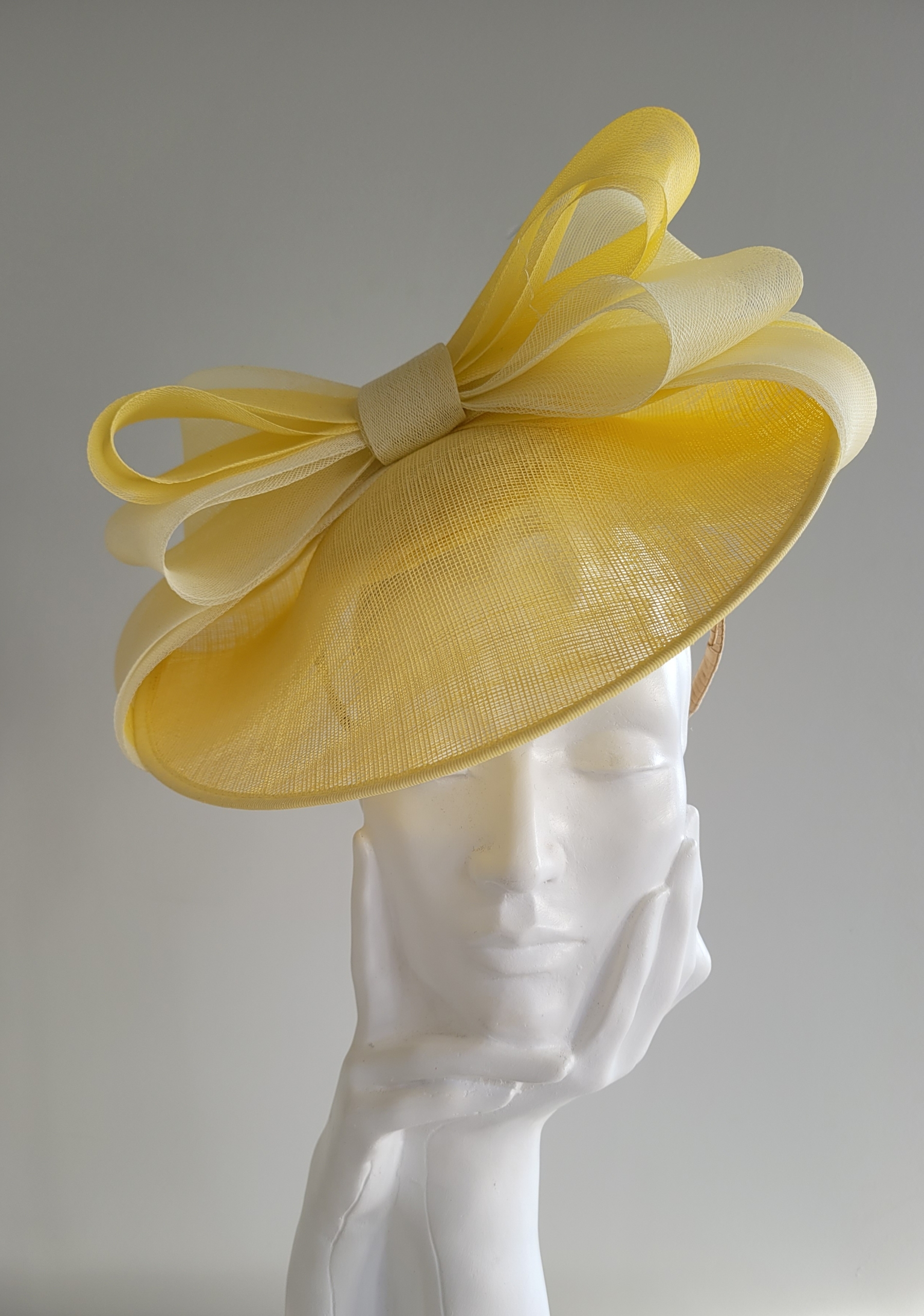 The Tourmaline dish hat is the perfect, neat wedding or race day hat. This hat comprises a 12″ sinamay dish base trimmed with a generous crinoline bow that wraps underneath the brim of the hat to the back. You can choose up to two colours for the bow, whether they are tonal or completely clashing we love this detail.
