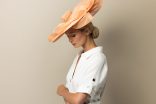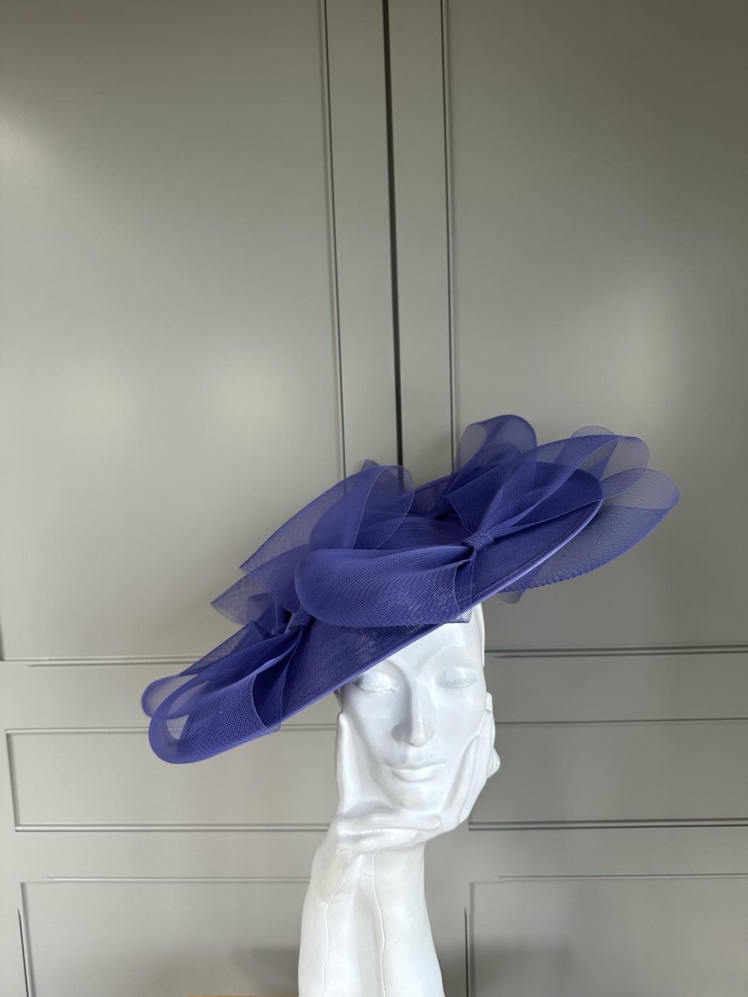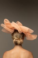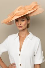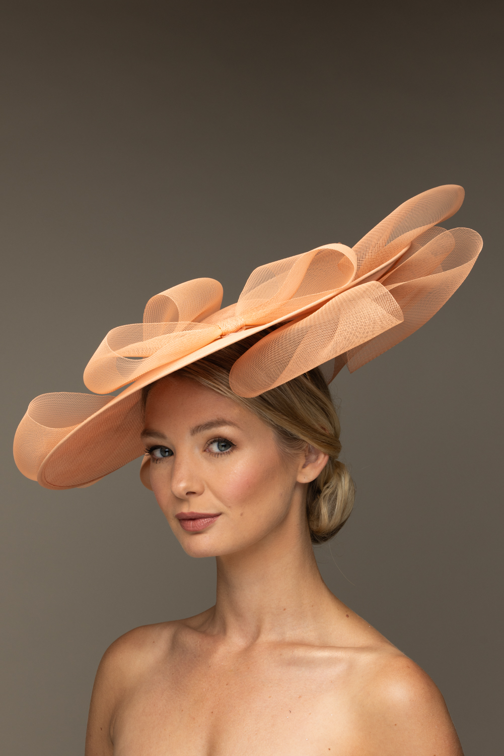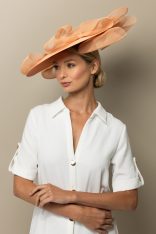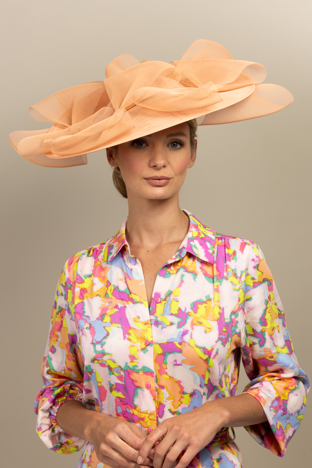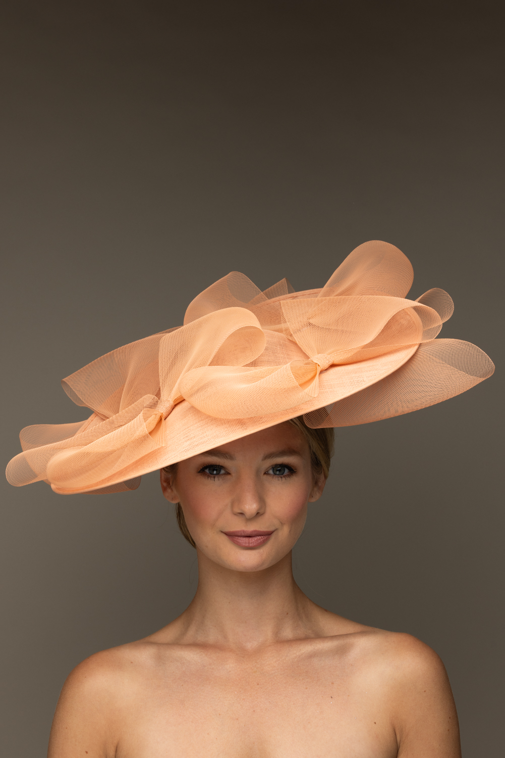The Thatcher dish hat is certain to make a statement. It comprises an 18″ sinamay dish base trimmed both above and below the brim with generous crinoline bows.