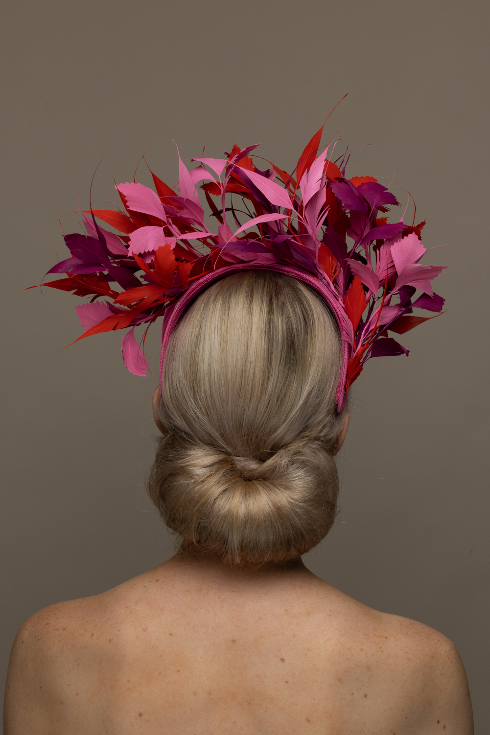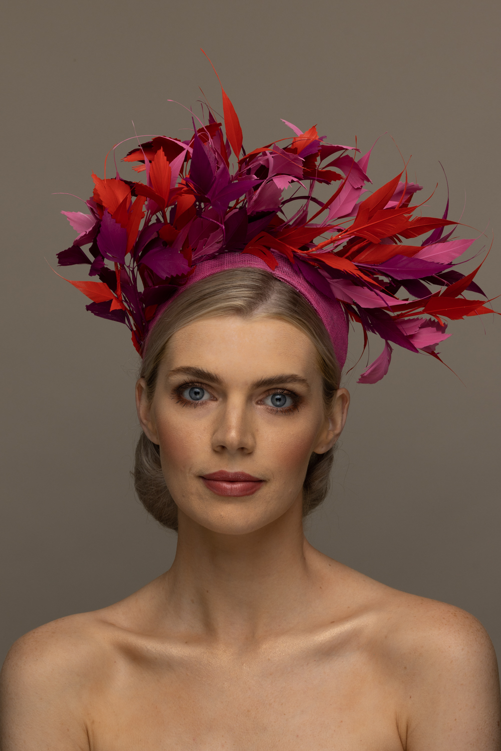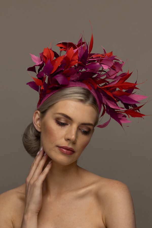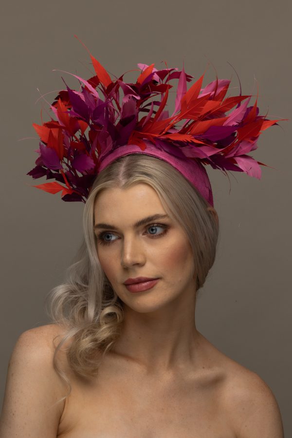 The Tiger headband comprises a comfortable double headband covered in a wide sinamay band which is then trimmed with  spiked and zig-zag trimmed feathers in up to three colours.