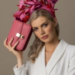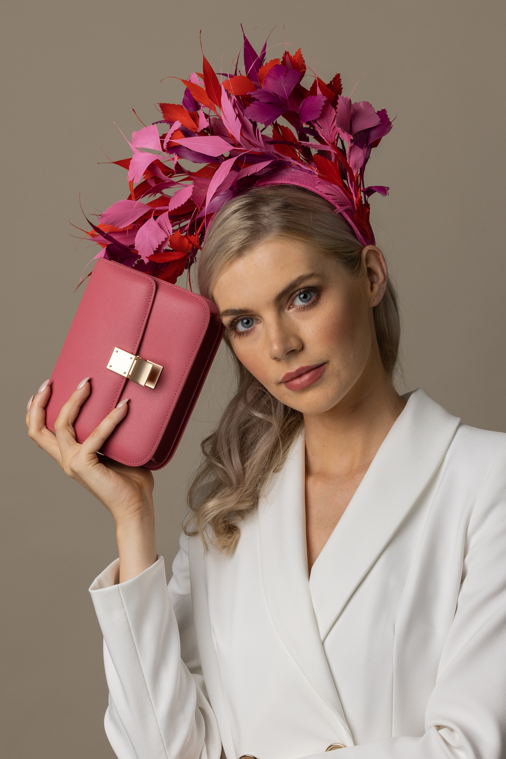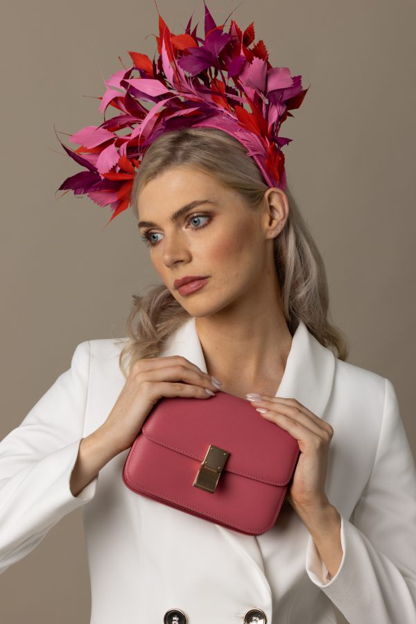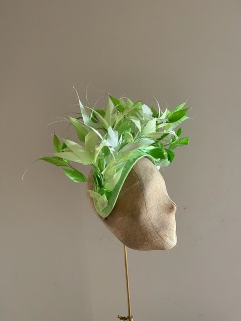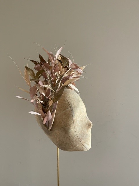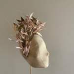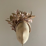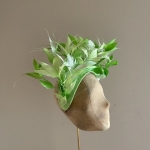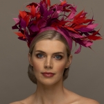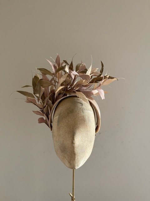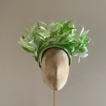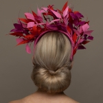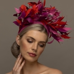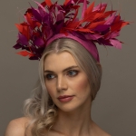 The Tiger headband comprises a comfortable double headband covered in a wide sinamay band which is then trimmed with  spiked and zig-zag trimmed feathers in up to three colours.