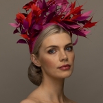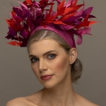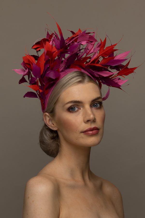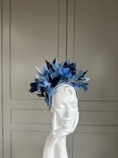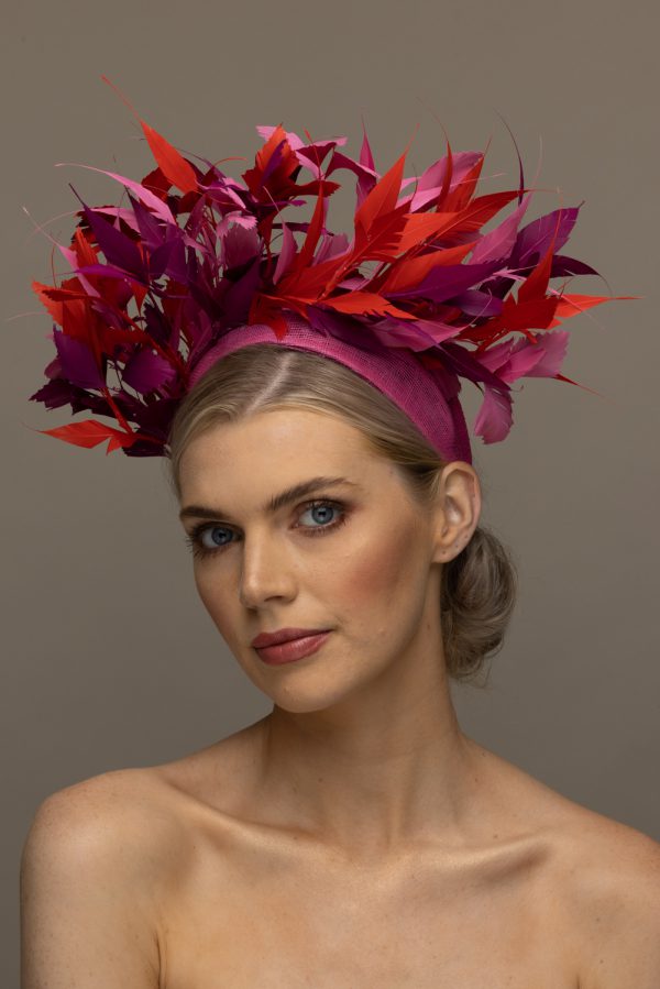 The Tiger headband comprises a comfortable double headband covered in a wide sinamay band which is then trimmed with spiked and zig-zag trimmed feathers in up to three colours.