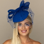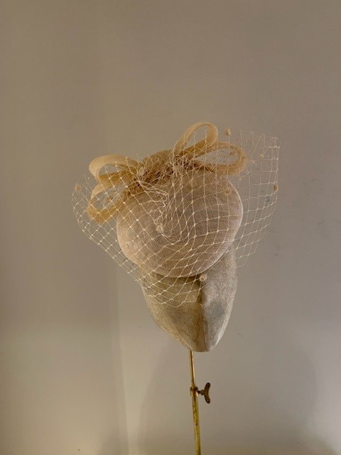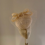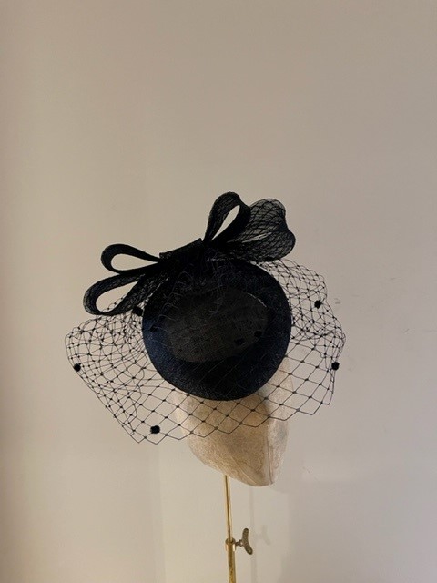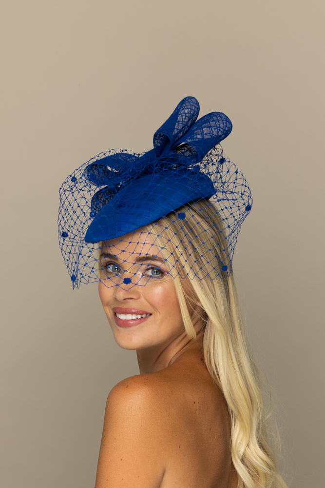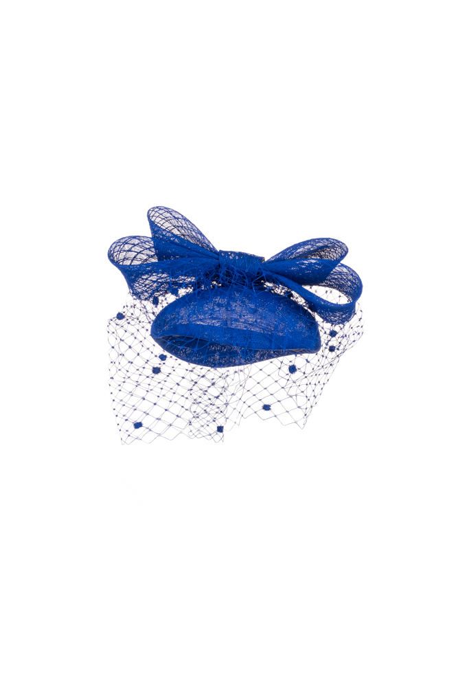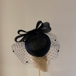 The Tinos pillbox hat comprises a sinamay pillbox base trimmed to the back with a diamond crinoline bow set off beautifully with spot veiling. The hat and bow are in one colour and you can choose to have a contrasting coloured veil.