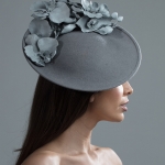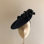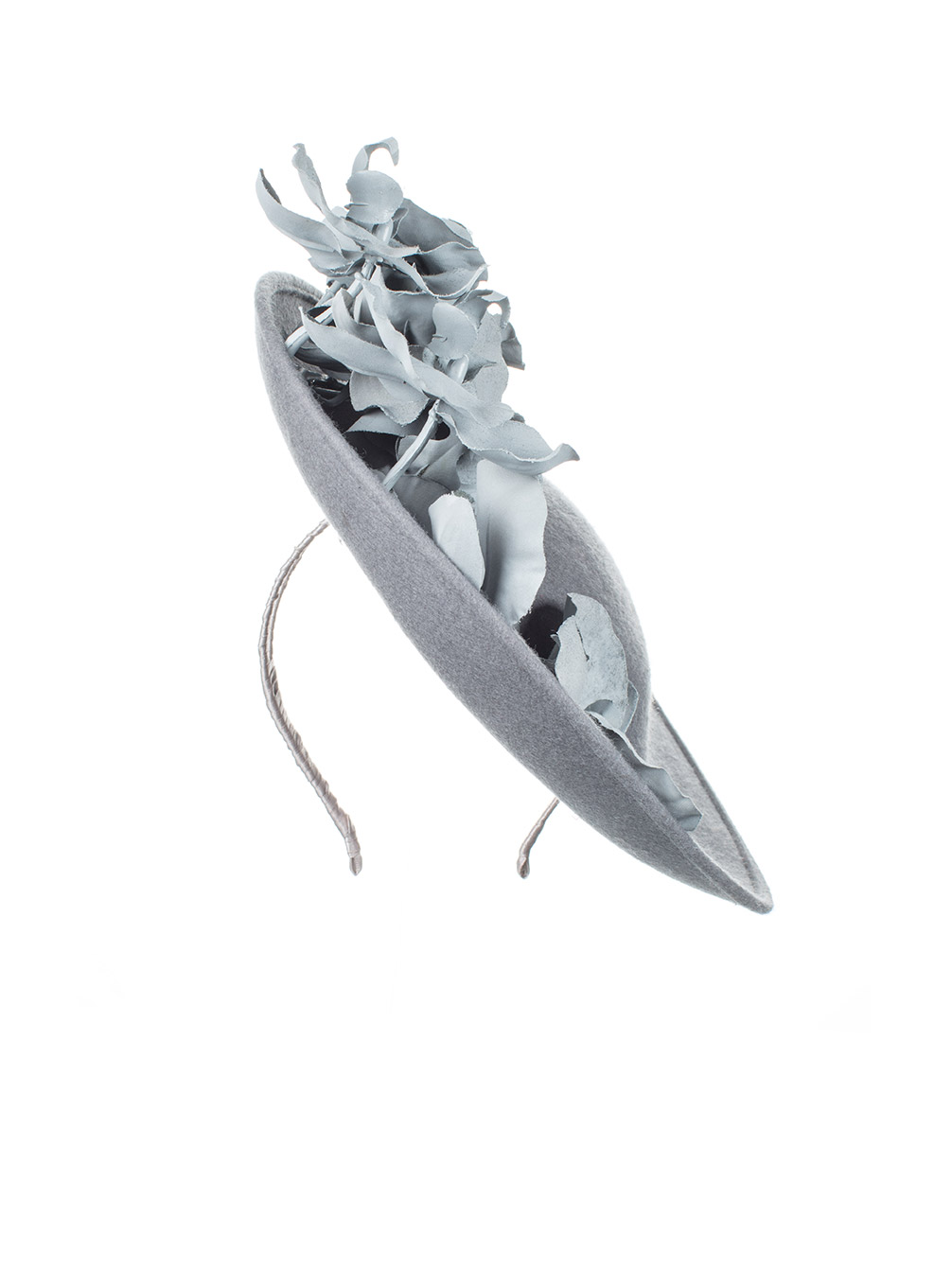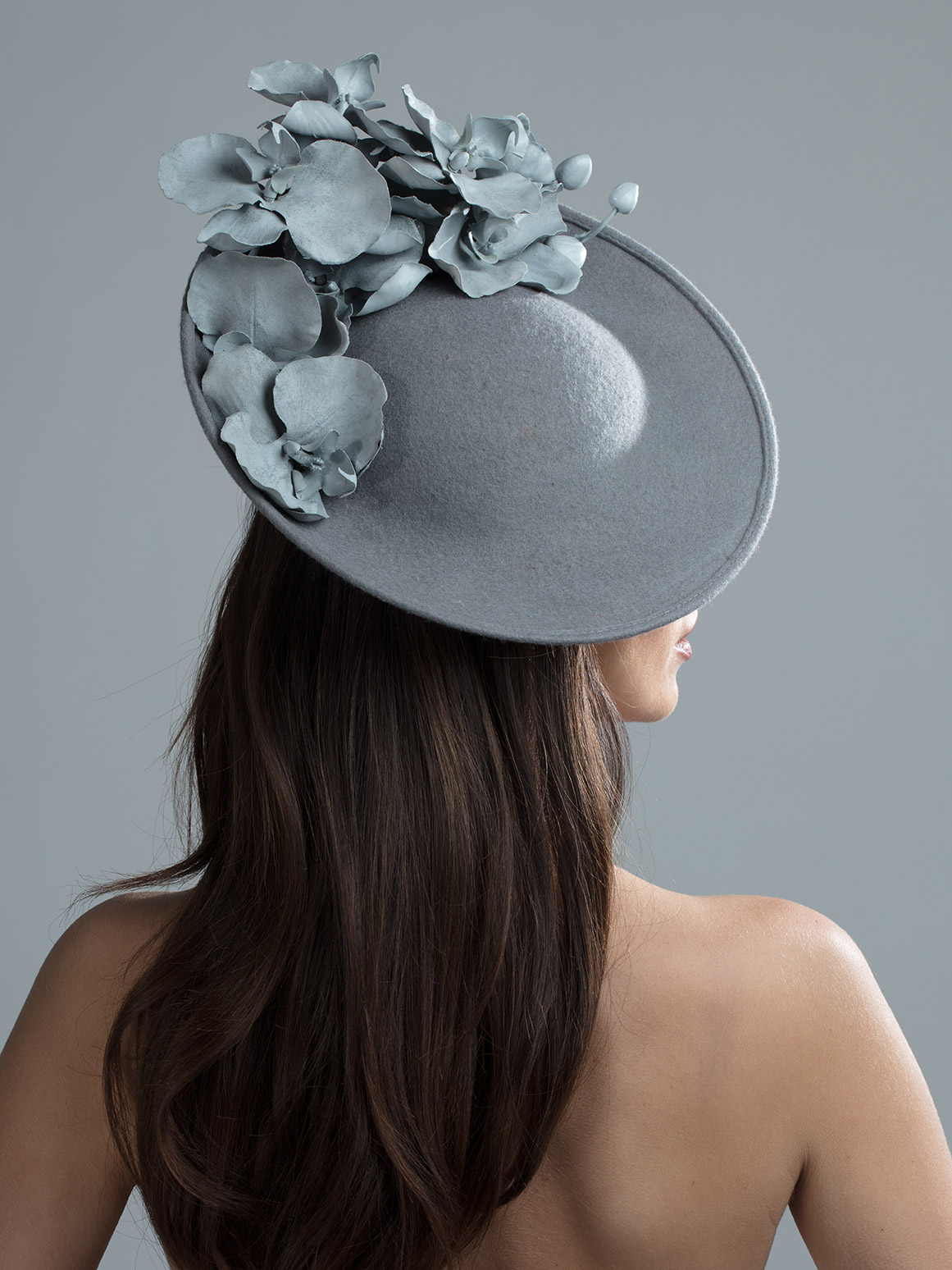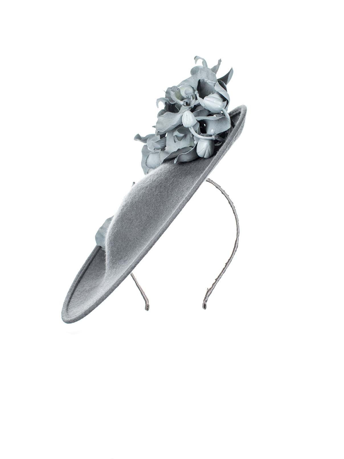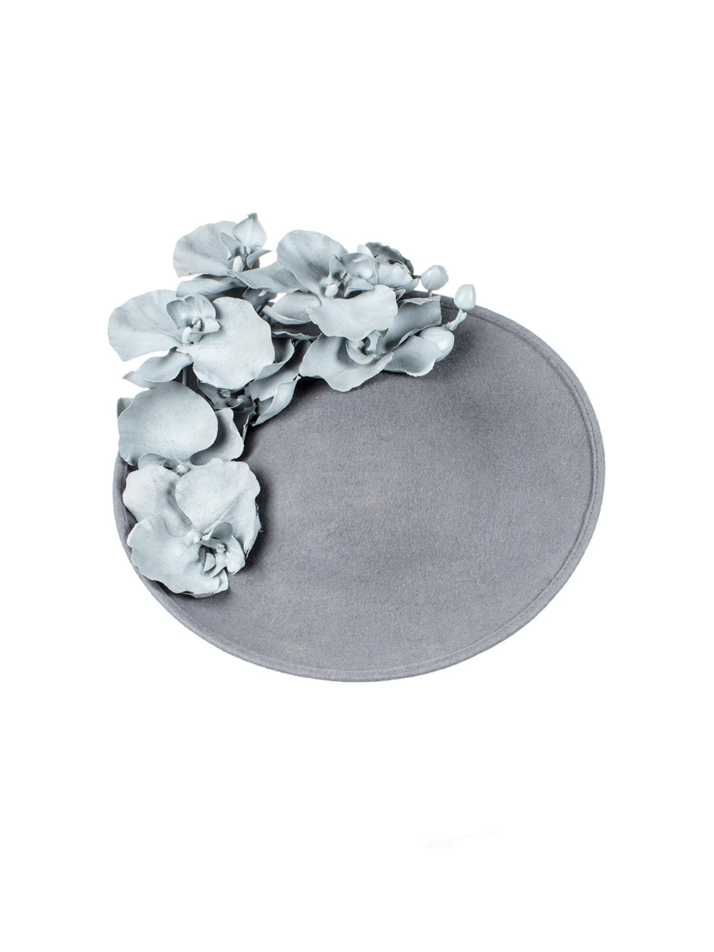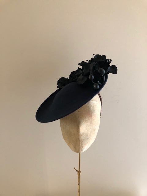 The Tolstoy dish hat comprises a felt dish base adorned with a sweep of orchids to the top edge of the dish. This hat is a beautiful hat for a winter wedding or for a smart day at the races. This hat comes on a comfortable and secure double hair band which we wrap to match your hair colour.