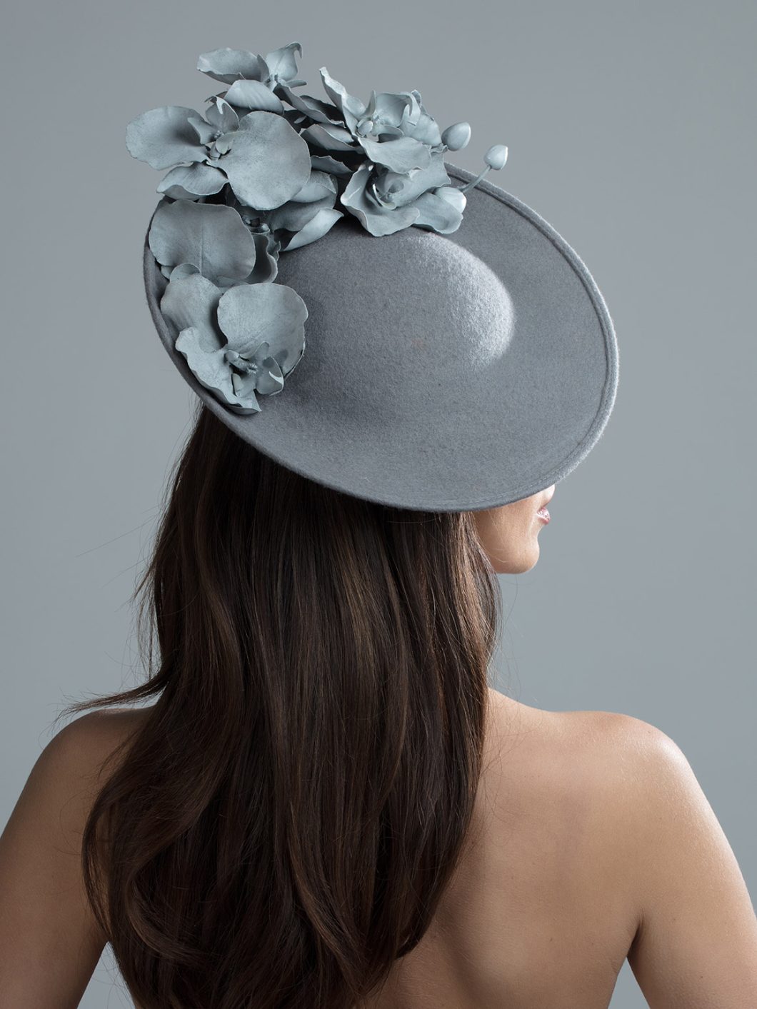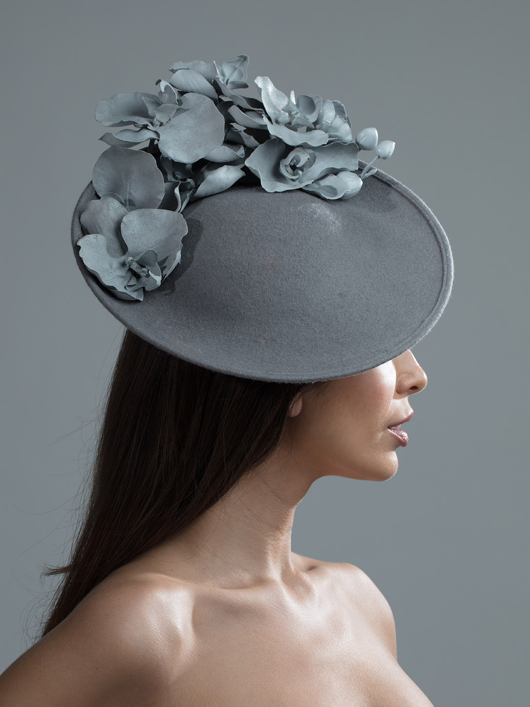 All of our hats are available in any colour way. Please see our felt colour charts to help you to choose the base colour of your Tolstoy Dish Hat. The orchids are available in these colours. We are happy to send out colour swatches so you can be sure that the colours you choose match your outfit. Please click here to order your colour swatches.