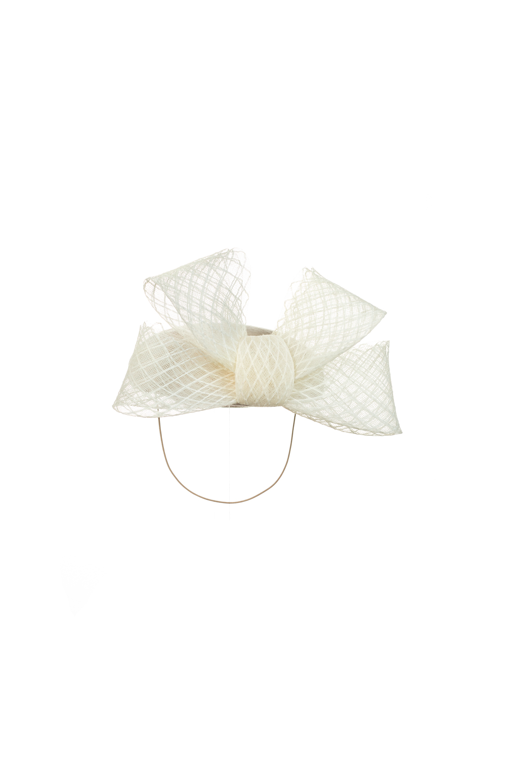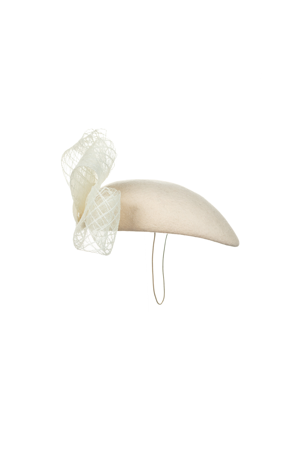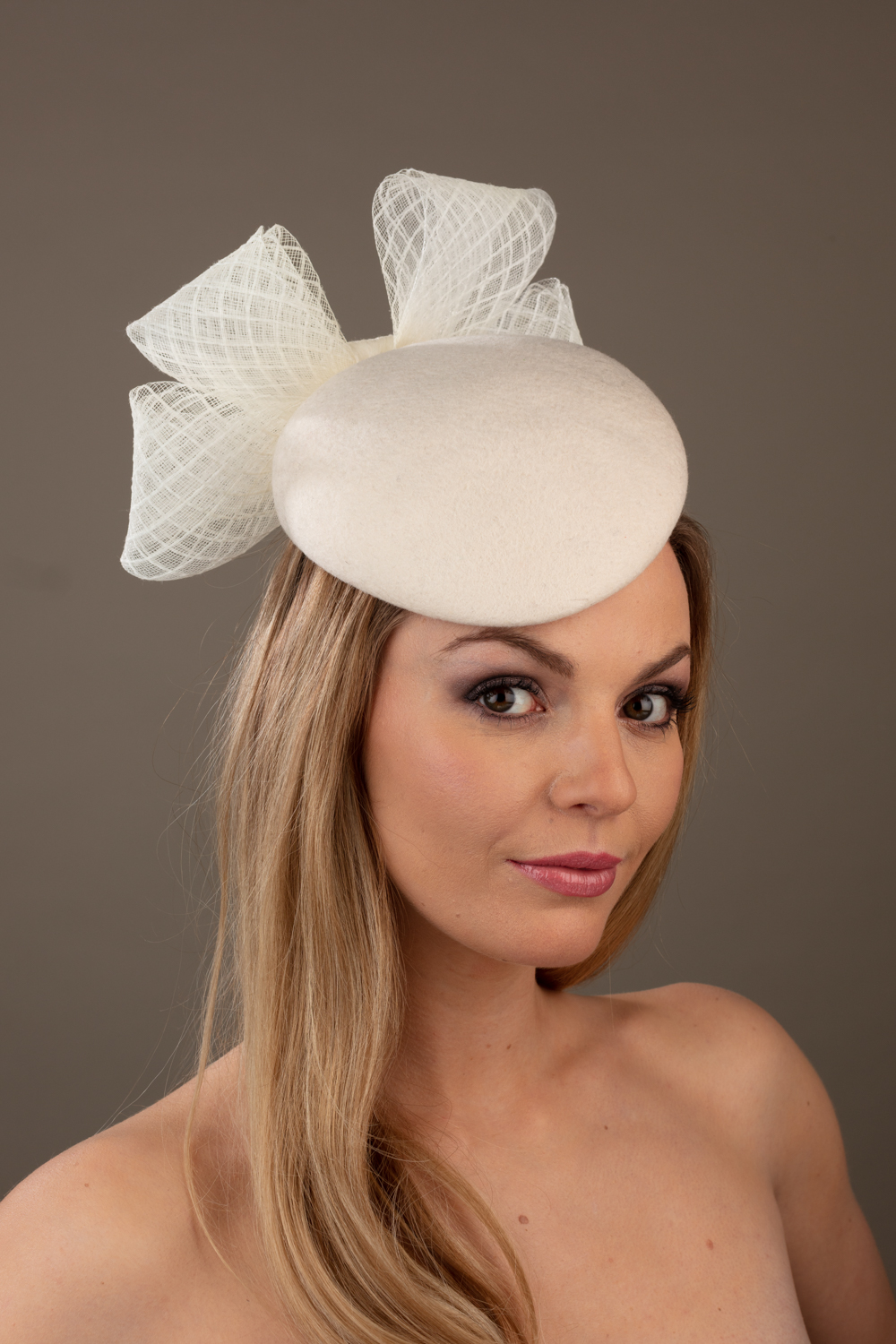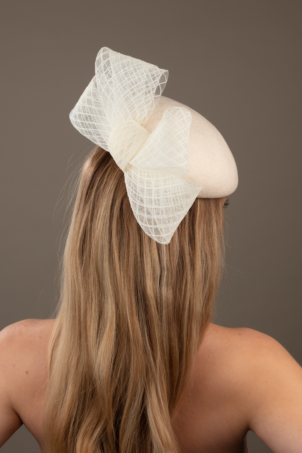 The Vino Pillbox Hat, shown here in stunning winter whites, is a great petite head piece for a winter wedding, Christening or Race meeting. The Vino Pillbox comprises a felt base adorned to the back with a diamond patterned sinamay double bow.