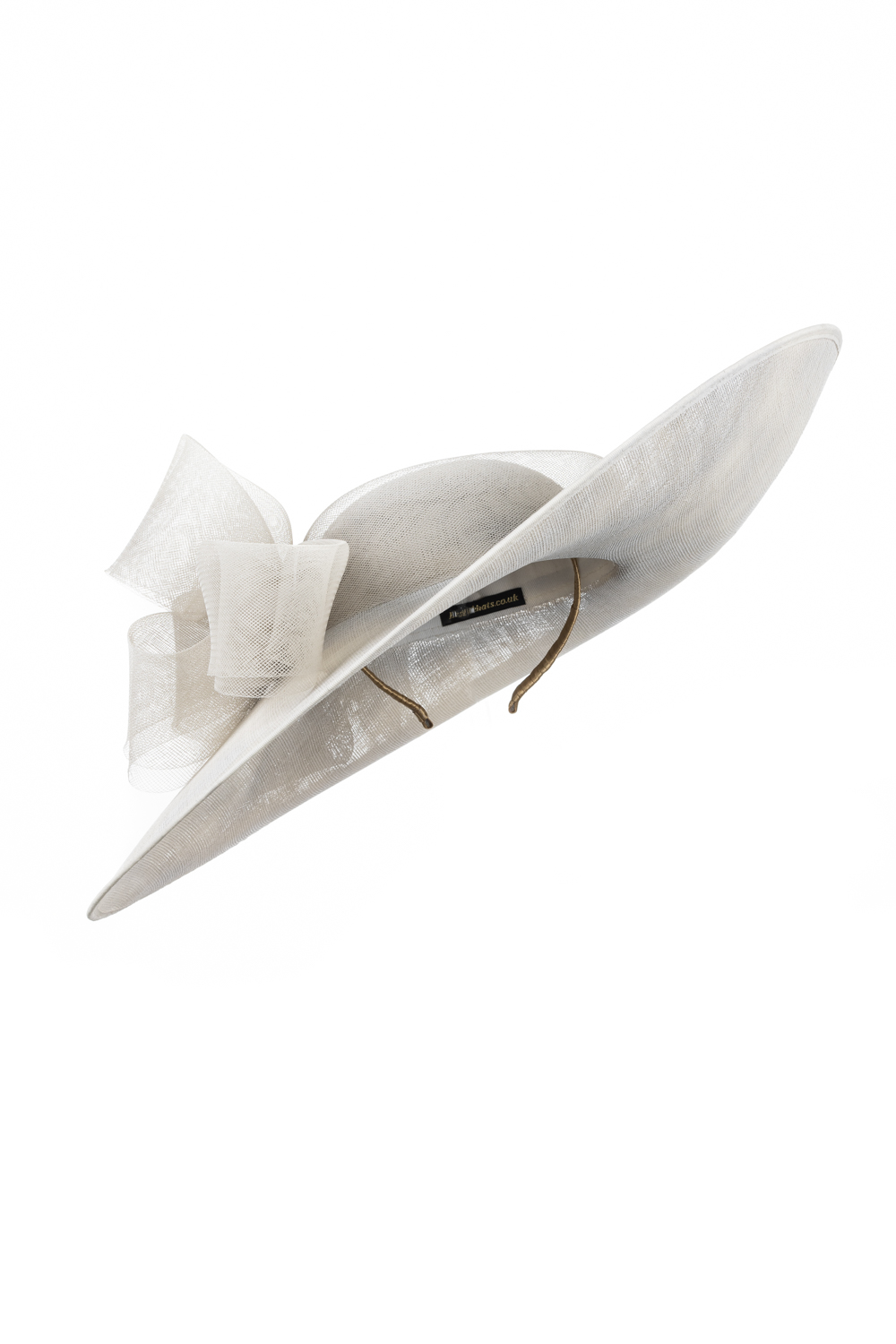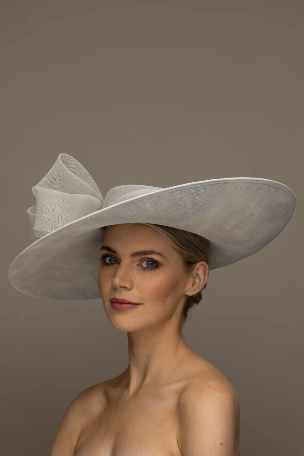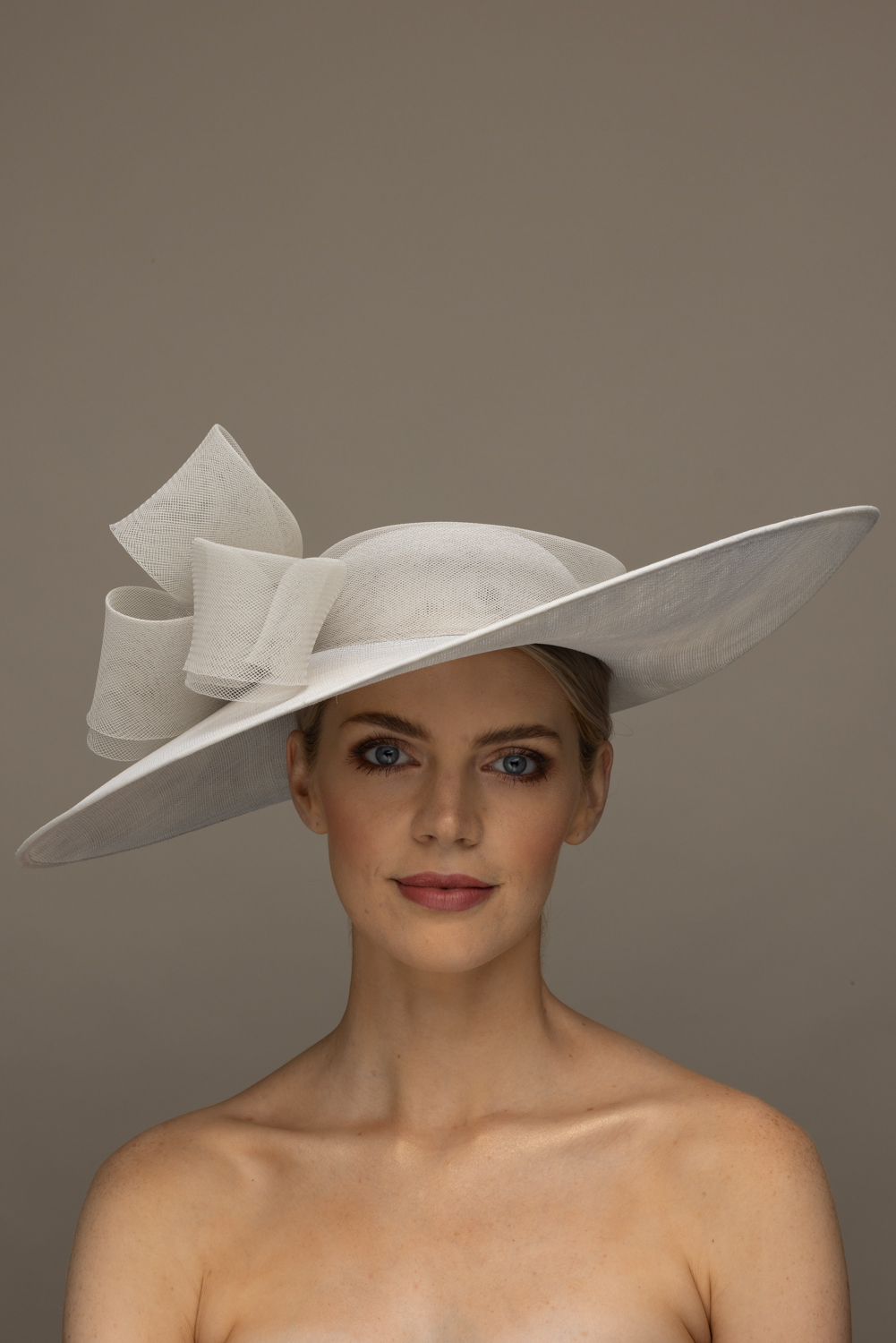 The Whitaker Hat is the perfect choice for a wedding hat. The sinamay hat features a crown with east to west angled brim with an upturn to the top side. The hat is then trimmed with a band and stunning triple looped bow made from plain crinoline.