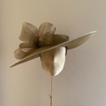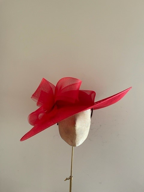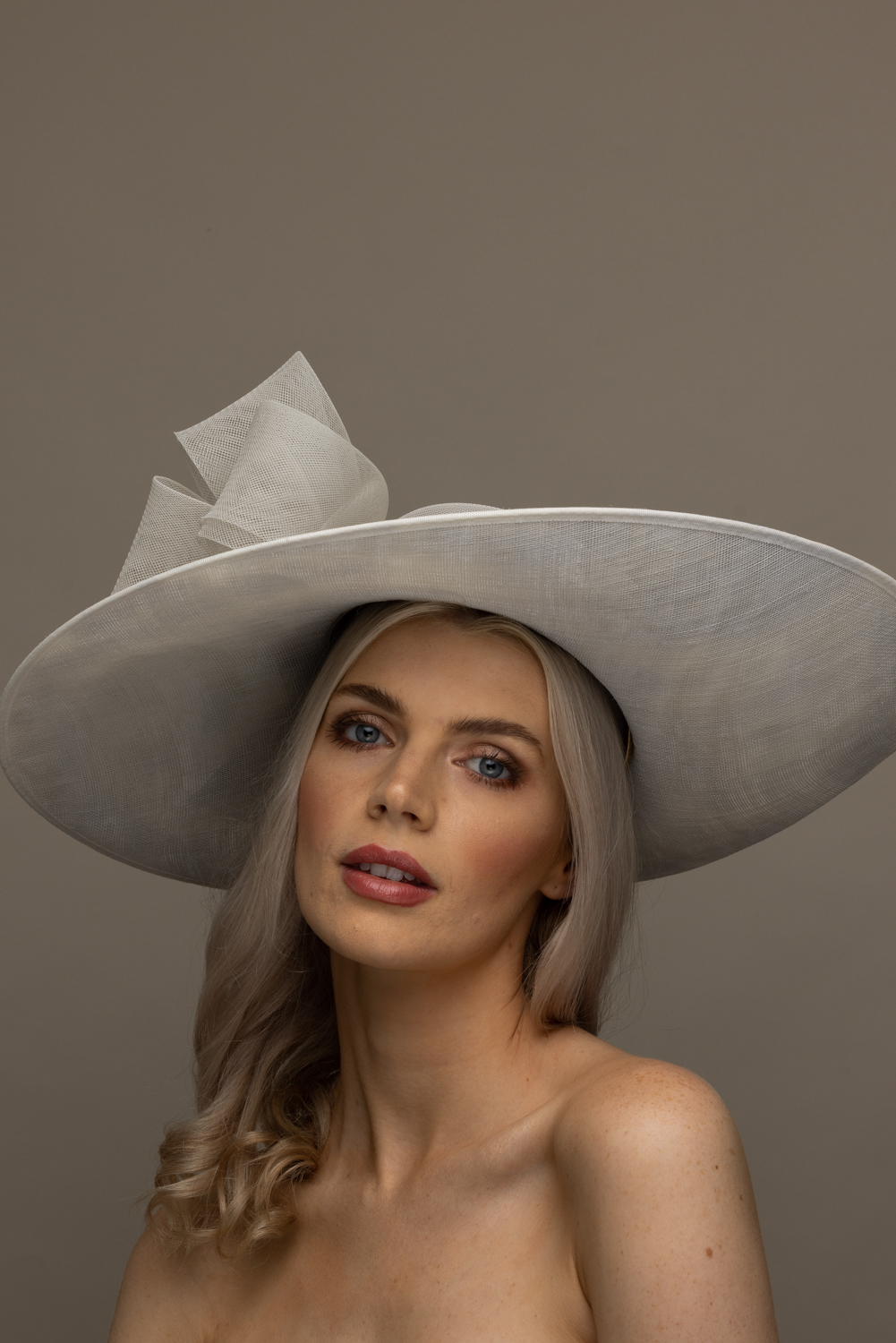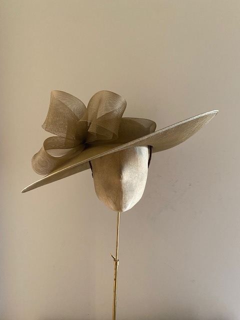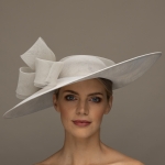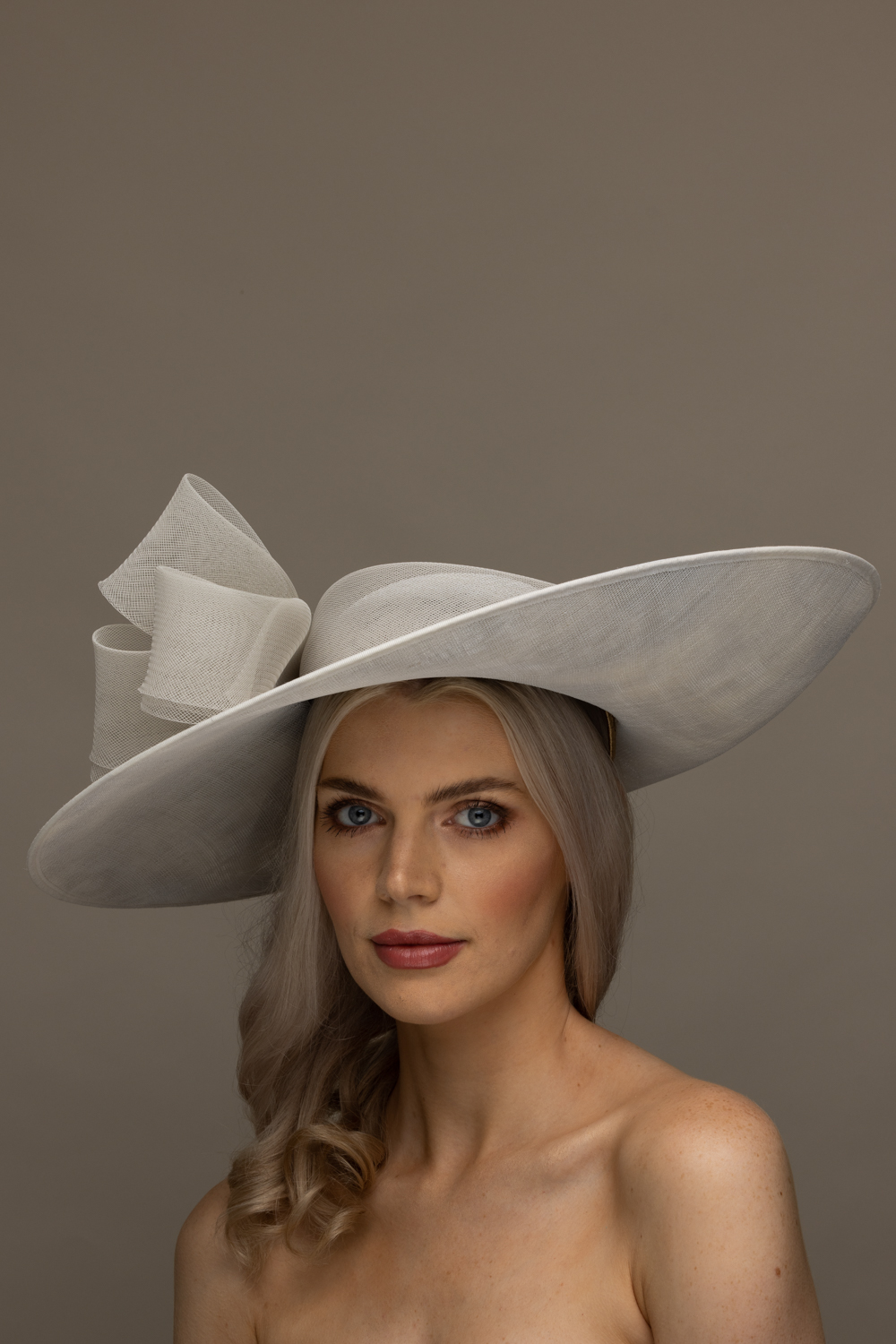 The Whitaker Hat is the perfect choice for a wedding hat. The sinamay hat features a crown with east to west angled brim with an upturn to the top side. The hat is then trimmed with a band and stunning triple looped bow made from plain crinoline.