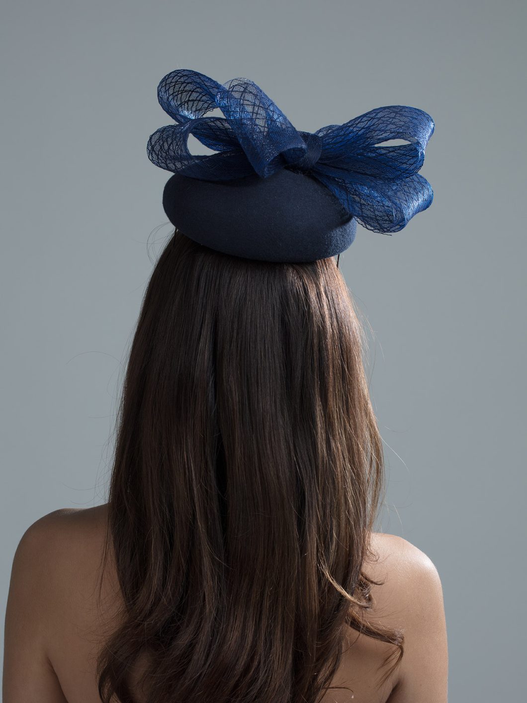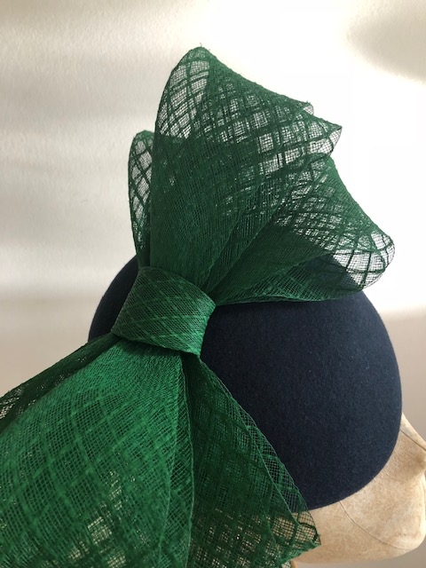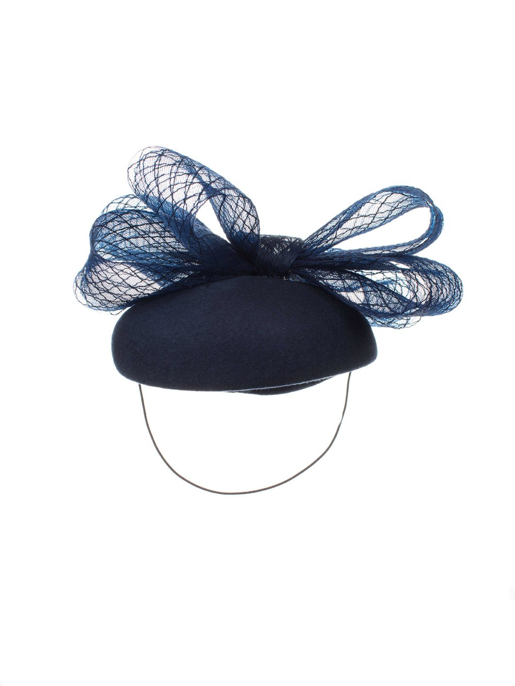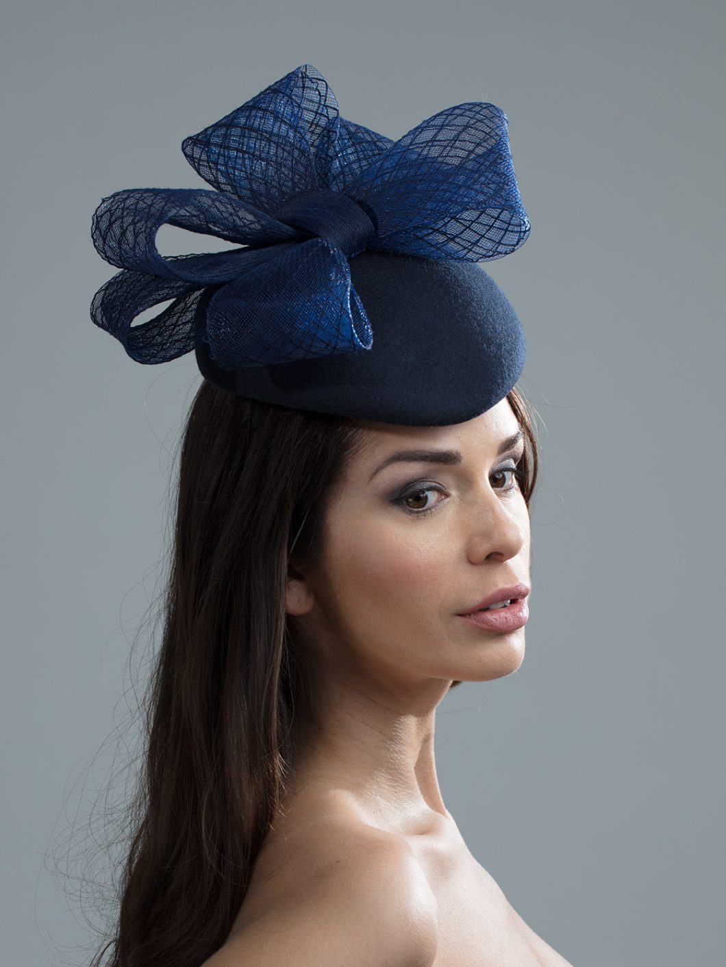 The Wilde Pillbox hat comprises a felt pillbox base trimmed with a large triple looped bow in diamond patterned crinoline.