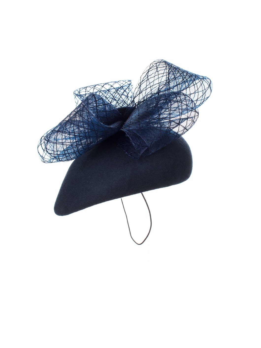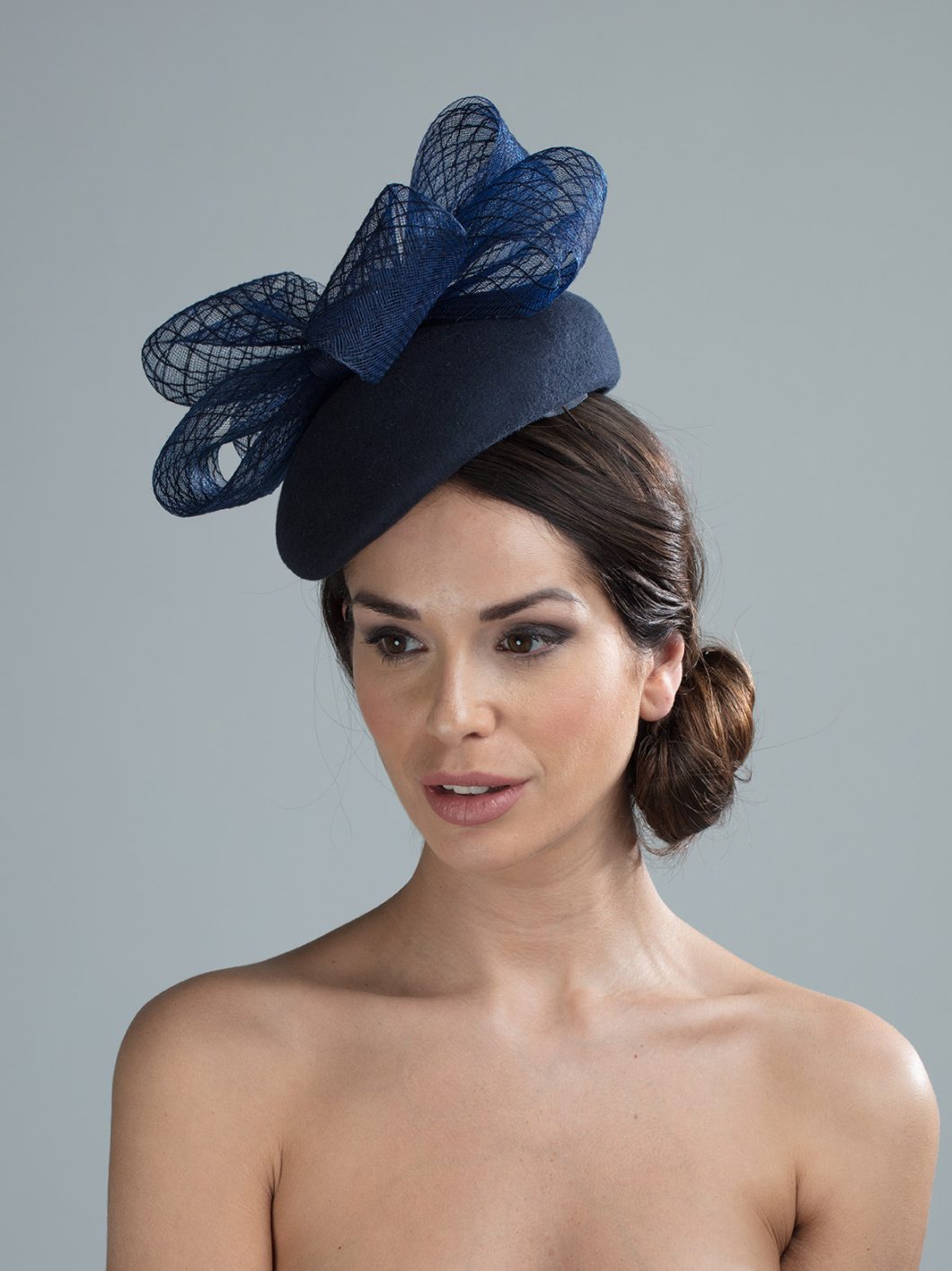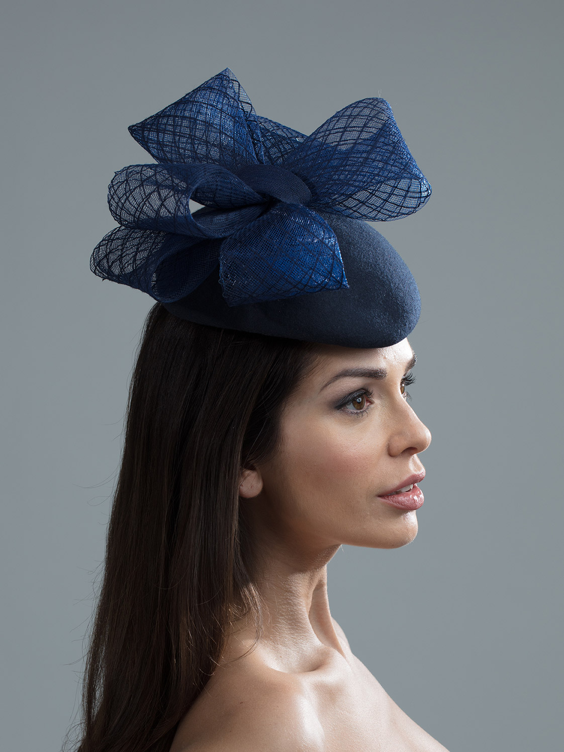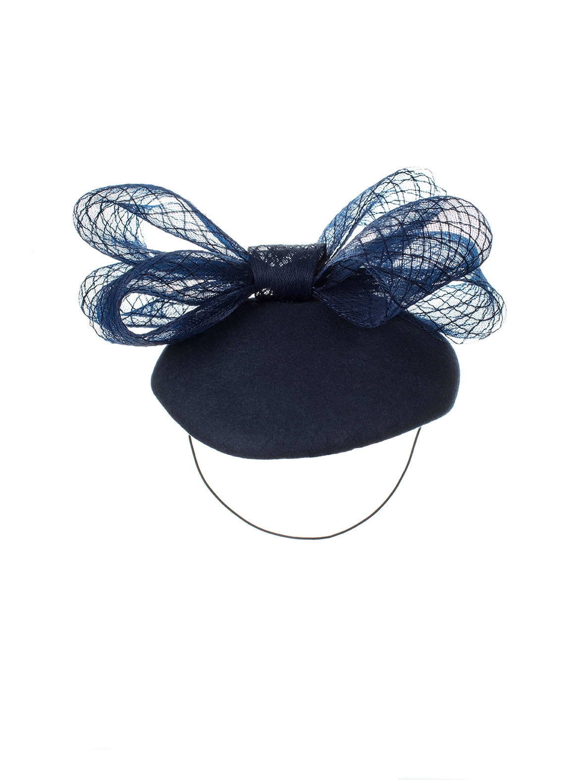 The Wilde Pillbox hat comprises a felt pillbox base trimmed with a large triple looped bow in diamond patterned crinoline.