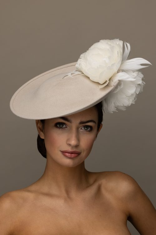 We suggest this hat is fitted with elastic for a closer positioning to your head, however if you would prefer a hair band this is an option too; both of which will be colour matched to your hair colour.