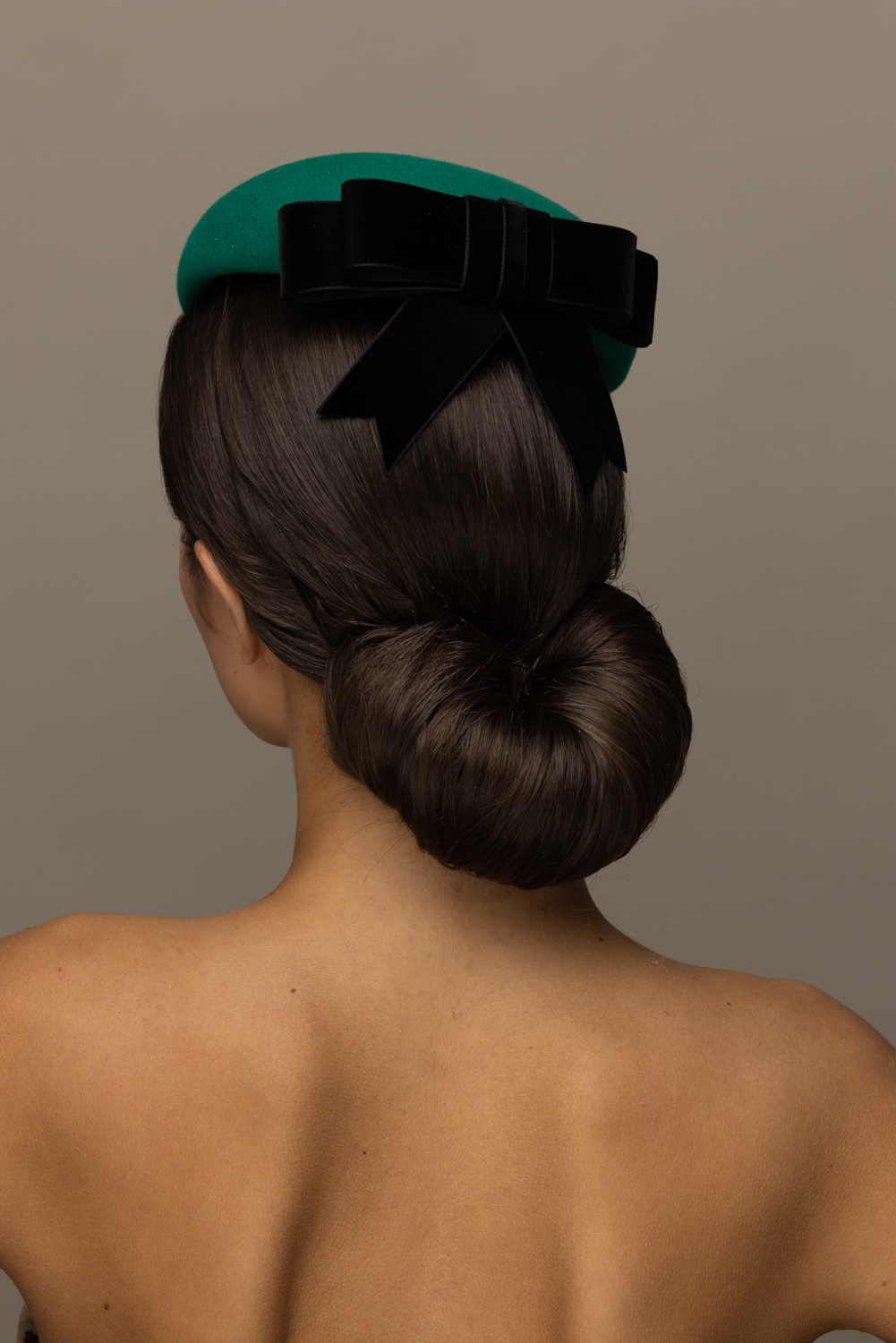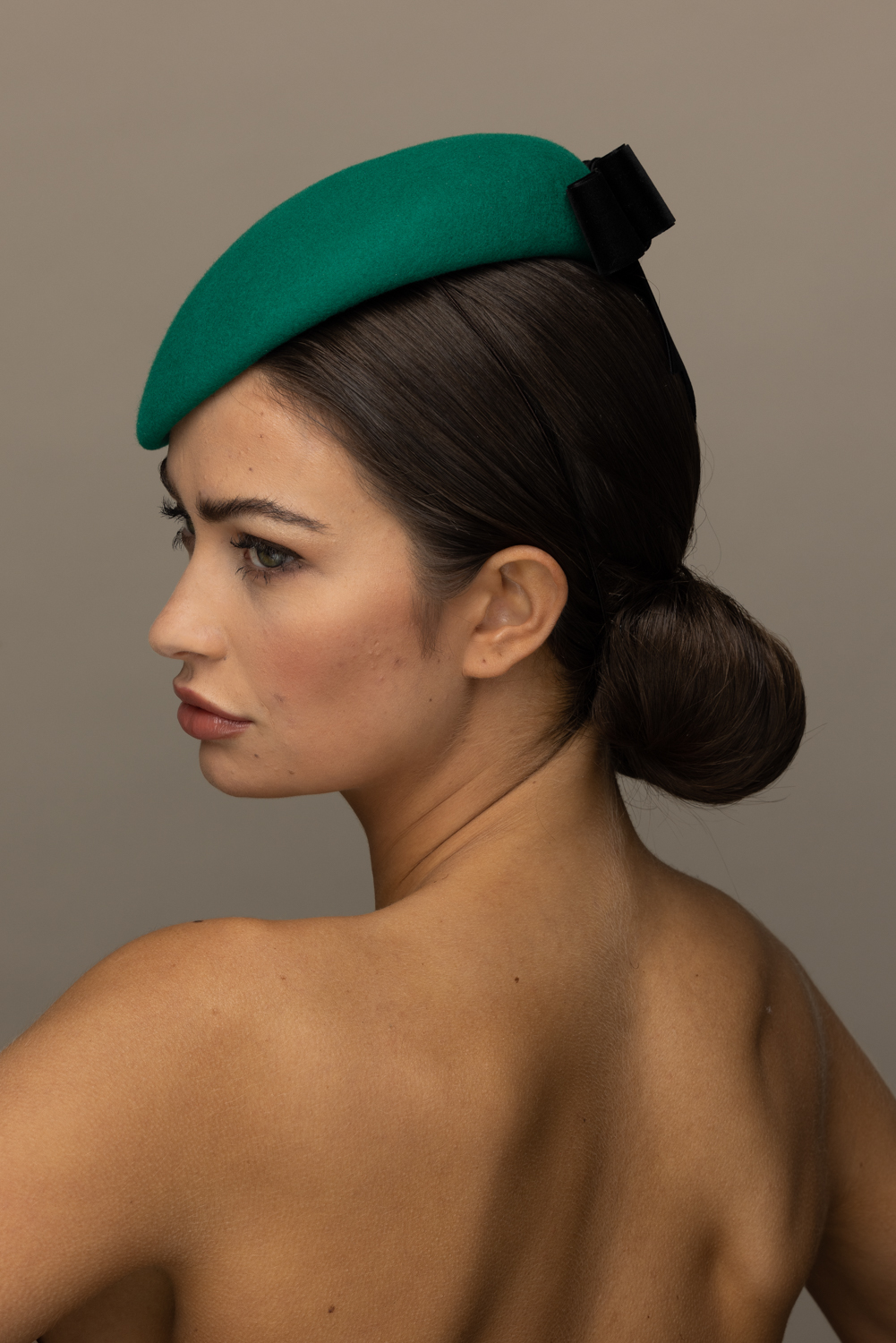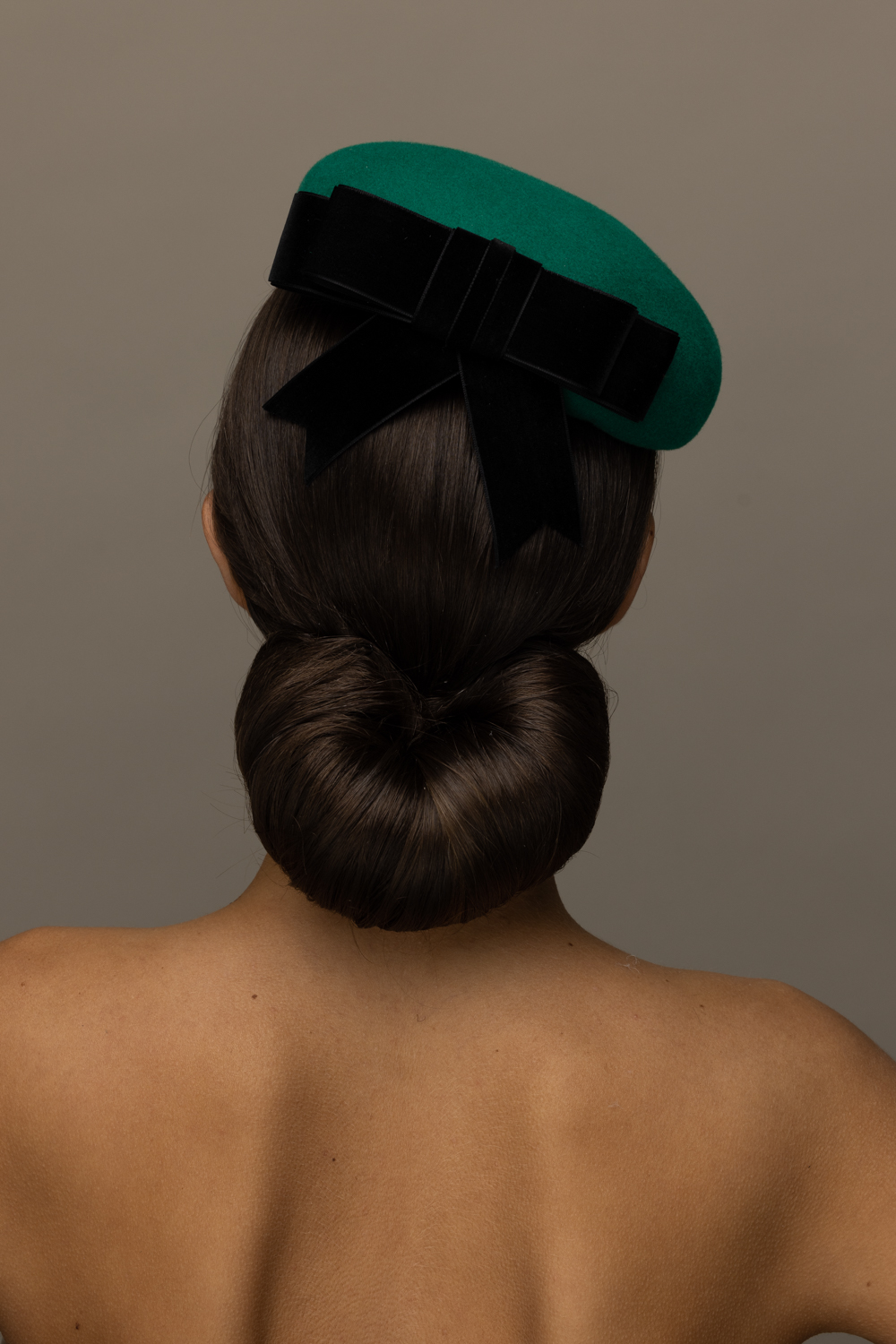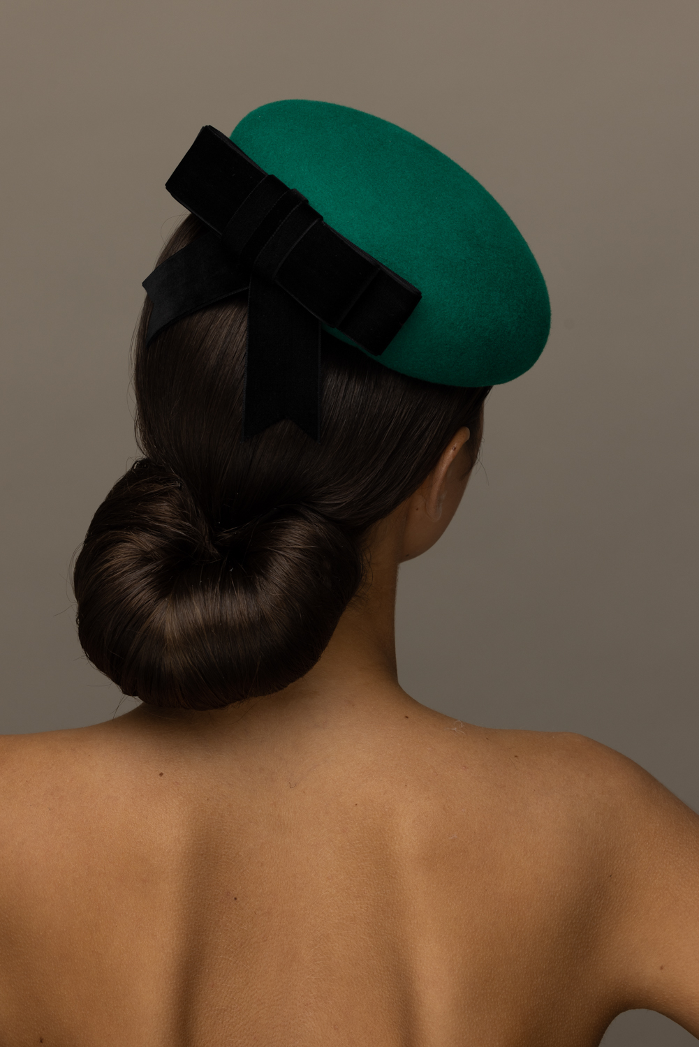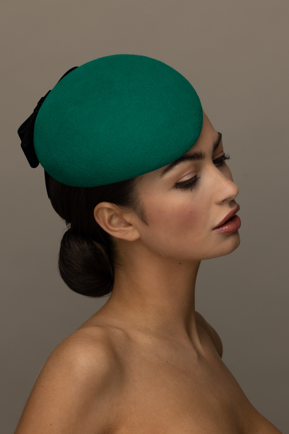 The Yew Pillbox Hat is a beautifully understated hat. It comprises a felt pillbox base trimmed to the back with a velvet bow.