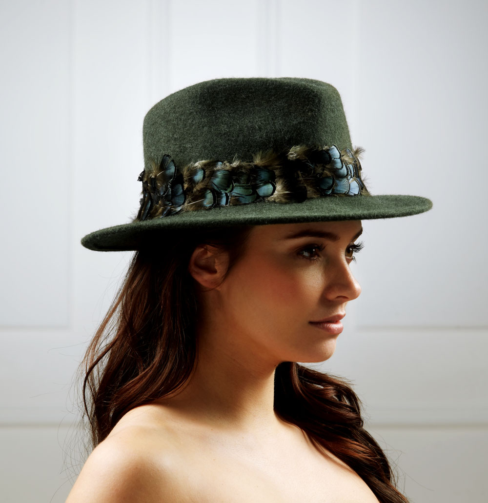 Aquarius Fedora Hat in country green with green feather trim by Hostie Hats